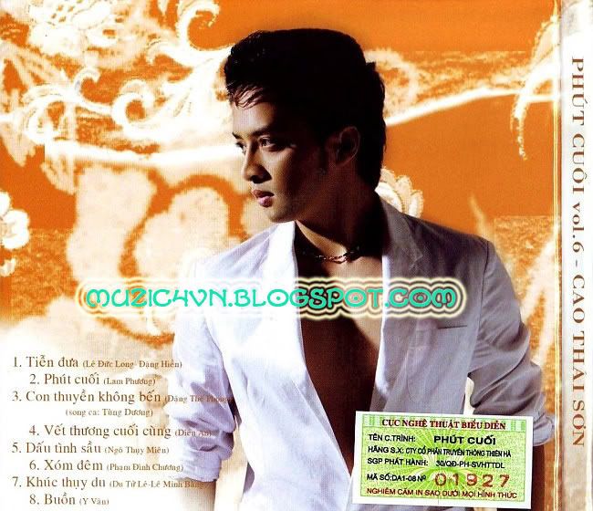 Album mới nhất của ca sĩ Cao Thái Sơn mang tên " Phút Cuối - Những Tình Khúc Bất Hủ " được phát hành bởi CTCP Thiên Hà gồm 8 ca tình khúc rất nổi danh như " Buồn " , " Phút Cuối " ," Tiễn Đưa "... đặc biệt là "Con Thuyền Không Bến " hát chung với Tùng Dương .Với giọng ca Cao Thái Sơn thấm đậm những tâm sự đã để lại trong lòng người nghe nhiều cảm xúc .Một Album không thể không nghe thử.Đang editTitle : Phút Cuối - Những Tình Khúc Bất Hủ