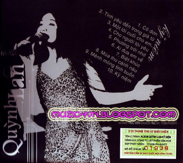 Quỳnh Lan là giọng hát nữ chuyên biểu diễn phòng trà TP HCM tri ân nhạc sĩ Nguyễn Ánh 9 bằng một album gồm 10 ca khúc cô yêu thích. Đáp lại, nhạc sĩ đưa ra ý tưởng hòa âm và góp ý cách thể hiện cho Quỳnh Lan .Ngay khi Quỳnh Lan đề nghị được thể hiện các tác phẩm của Nguyễn Ánh 9, ông đã đồng ý, bởi "đó là người ca sĩ mà tiếng hát cất lên từ chính tâm hồn, cảm xúc của mình".Đặc biệt Nhạc sĩ Nguyễn Ánh 9 đệm đàn cho Quỳnh Lan hát CD này.Ngoài những nhạc phẩm quen thuộc như "Cô đơn", "Tình yêu đến trong giã từ", "Ai đưa em về", "Biệt khúc"..., album còn có 2 ca khúc nhạc phim ít được tác giả phố biến như "Cho người tôi yêu", "Phương trời nhớ". Theo nhạc sĩ Nguyễn Ánh 9, chính chất giọng tự sự của Quỳnh Lan đã khiến ông an tâm khi trình làng 2 ca khúc ít quen thuộc này.Rất đáng nghe phải không các bạn !Artist: Quỳnh Lan
